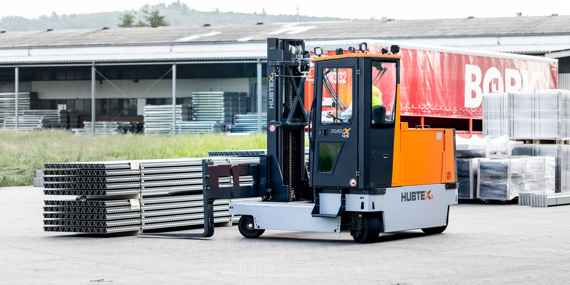 The MaxX electric multidirectional sideloader is designed for handling long goods in narrow aisles. With an entry-level price point, the forklift is the ideal alternative to diesel-powered vehicles for combined indoor and outdoor application. Sporting a new design, the MaxX offers best-in-class all-round visibility. It also features a spacious and ergonomic cabin, a clear view mast designed for maximum visibility, a patented HX steering system and a hydraulic levelling system developed by Hubtex.