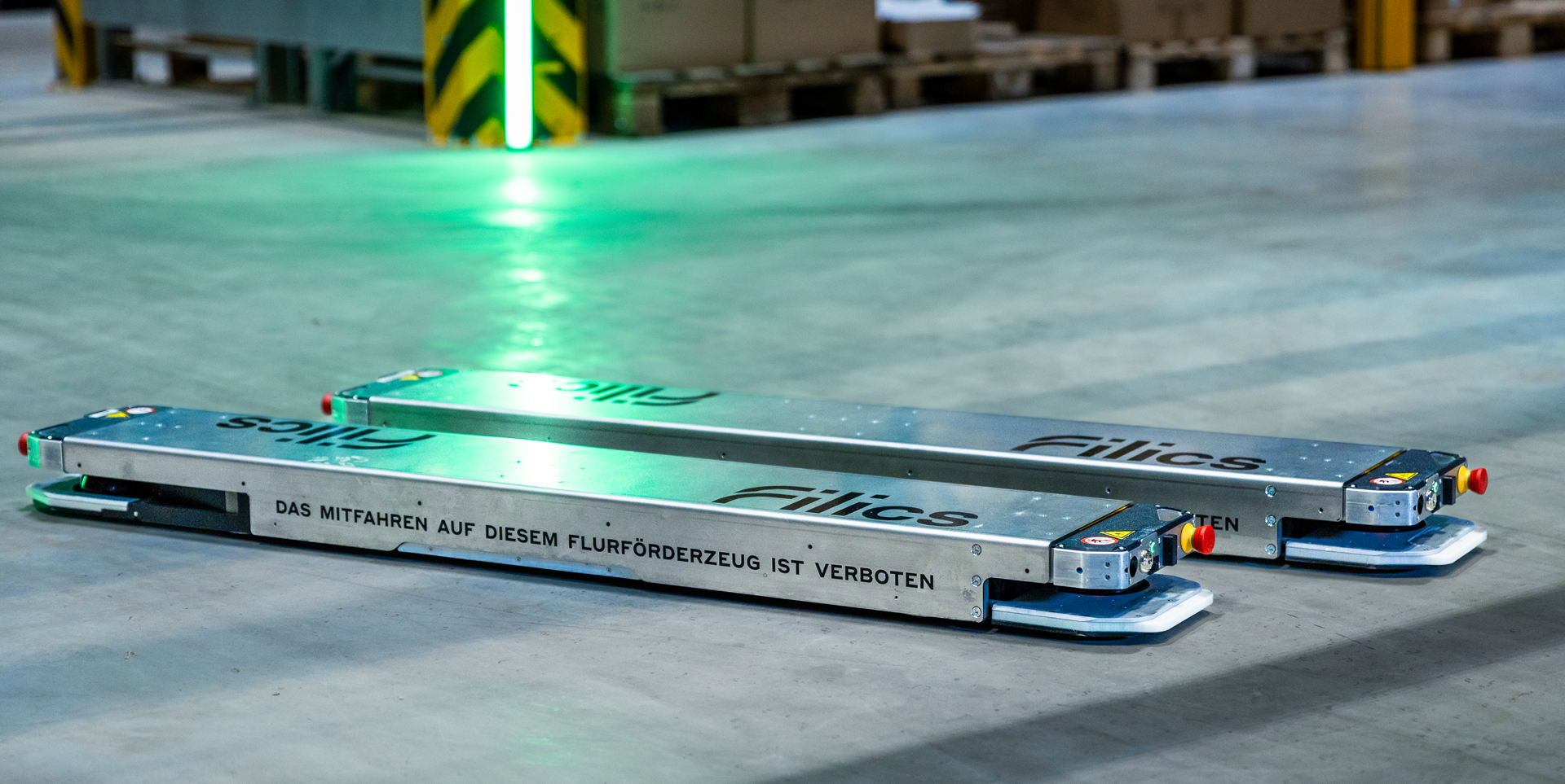 The Filics Unit, a double-skid system made up of two autonomously operating robots that together transport Euro-pallets or Euro-mesh boxes, sets new standards in the field of intralogistics. The compact design of the Filics Unit enables automated pallet movements in narrow environments and introduces new movement and process capabilities that cannot be achieved with manual or other automated logistics equipment.