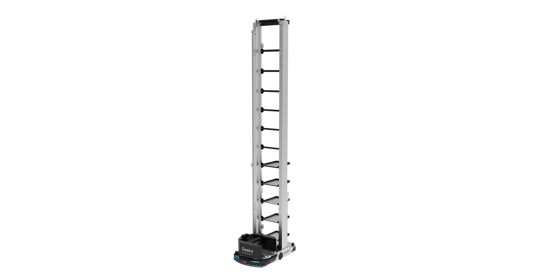 Geek+ RoboShuttle 11 is the world’s highest extended-depth, Tote-to-Person robot. It operates on narrow aisles with extended arms to reach new storage depth, saving up to 50 % of warehouse space over traditional storage methods. The robot also reaches new heights, covering storage from 0.285 meters to up to 11 meters, increasing the facility’s vertical storage capacity 5-fold.