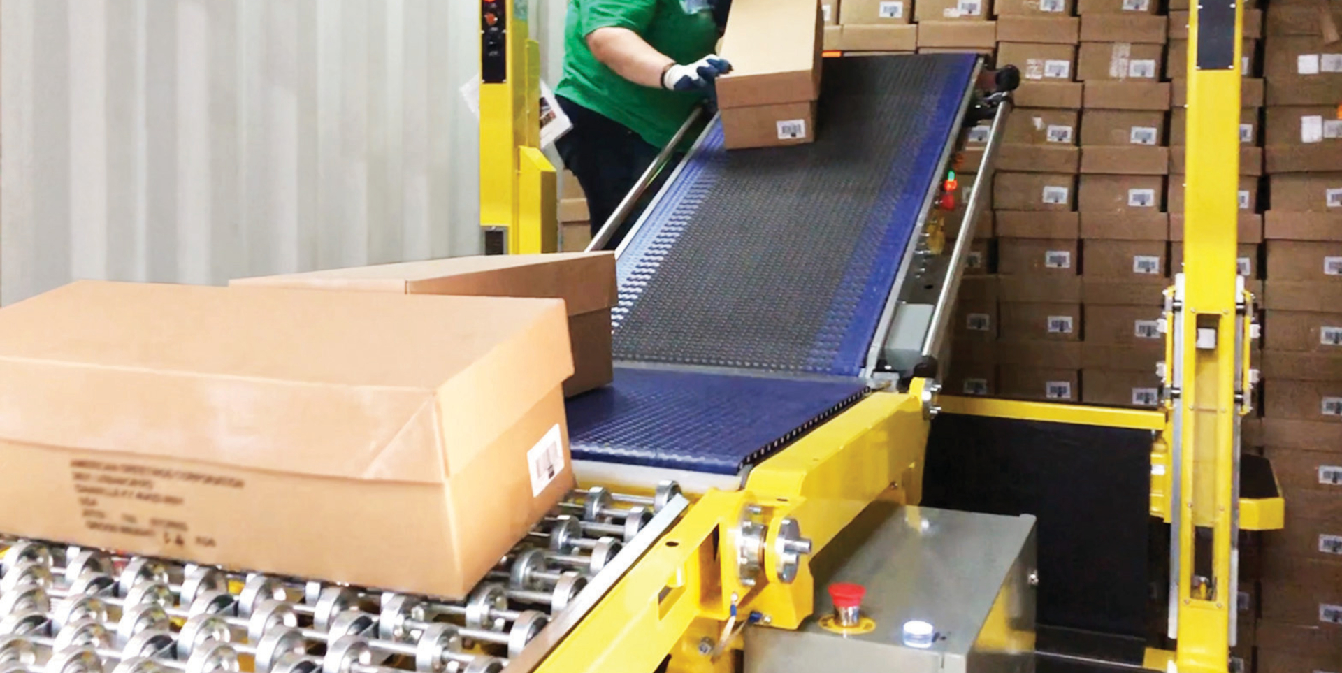 The Destuff-it system is an advanced unloading solution that significantly increases efficiency when unloading containers and trucks. Its ergonomic design improves safety and comfort by allowing operators to easily place boxes – whether on the floor or stacked high – onto the belt positioned at the same height, without the need for bending or twisting.