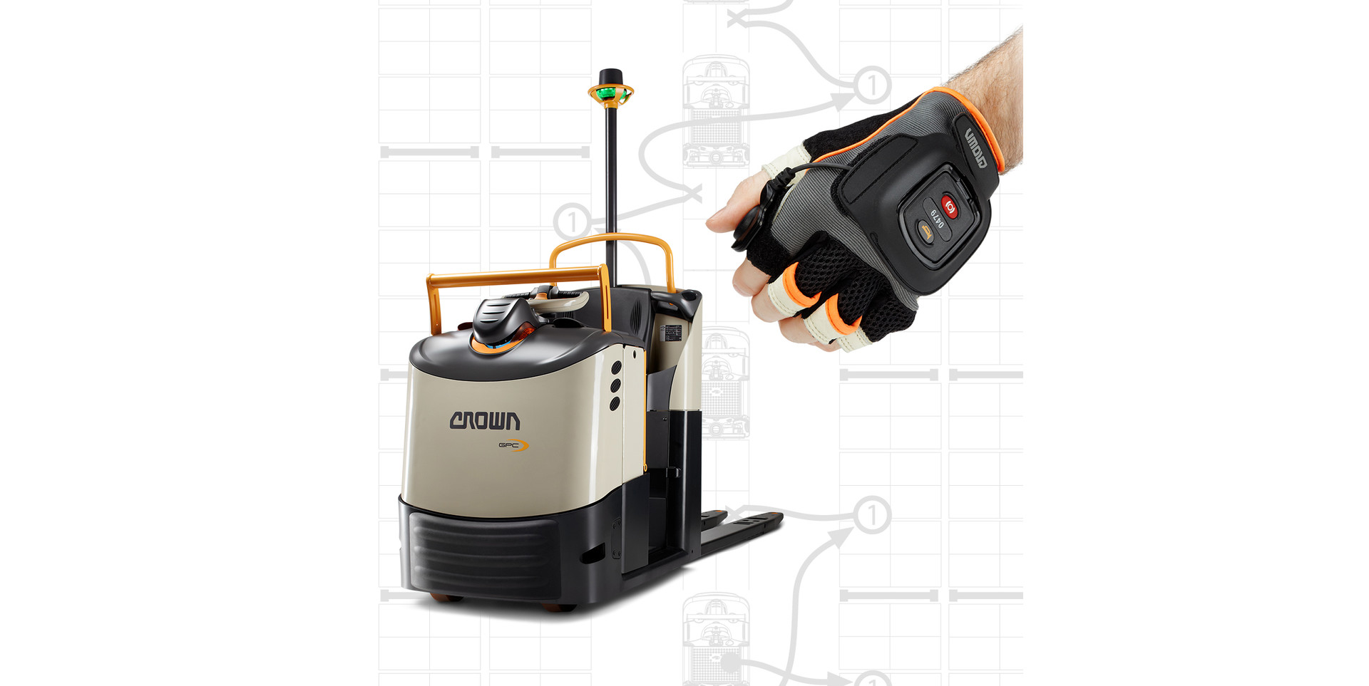 Der Crown Quick Pick Remote verfügt über einen speziellen Modus, der die Möglichkeit bietet, durch Tastendruck bis zum nächsten Entnahmepunkt des Kommissionierers vorzufahren, ohne dass sich der Bediener auf dem Fahrzeug befinden muss. Der entsprechende Taster ist in einem speziellen Handschuh integriert, wodurch der Bediener jederzeit beide Hände für die Kommissionierung frei hat. Der „QuickPick-Remote“ Modus des Fahrzeugs wird automatisch abgeschaltet, sobald der Mitarbeiter die Fahrerplattform betritt, wodurch die Unfallgefahr reduziert wird.