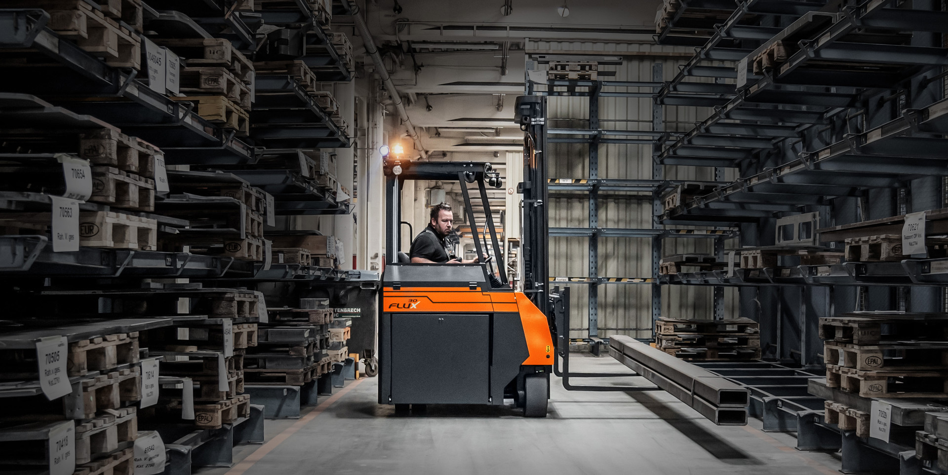 Für den FLUX 30 wird ein erheblicher Nutzen für Kunden gesehen, die Vielseitigkeit im Handling verschiedener Güter benötigen. Die Einsatzbreite des Staplers ermöglicht den Transport von Paletten und Langgut mit nur einem Gerät, was optimal für einen effizienten Betrieb ist und die Notwendigkeit verschiedener Geräte reduziert. Das Lenksystem mit der intuitiv einfachen Bedienung spart Zeit und reduziert den Verschleiß von Bauteilen. Dies führt zu niedrigeren Betriebskosten und damit zu einer höheren Produktivität. Die kompakte Bauweise des FLUX 30 ermöglicht den Einsatz in engen Lagerhallen und optimiert die Raumnutzung. Der emissionsfreie Elektroantrieb und die geräuscharme Arbeitsweise verbessern zusammen mit der ergonomischen Fahrerkabine das Arbeitsumfeld.